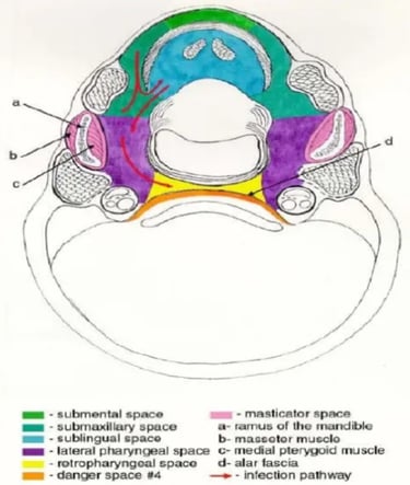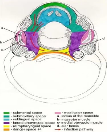 Kasus Abses area ini biasa dikenal abses leher dalam, kasus ini bisa mengancam jiwa. Resiko infeksi yang menyebar dapat merusak fungsi dari jaringan sekitarnya, Otot pengunyah contohnya. Jika infeksi menyebar ke otot pengunyah/otot masetter maka akan terjadi trismus/terkuncinya rahang yang menyebab pasien susah membuka mulut. Kalau susah buka mulut terus gmn? Ya makannya jadi susah pastinya, intake makanan dan cairan bisa kurang. Pada kasus yang lebih parah, infeksi bisa menyebar lebih luas dan menyebabkan henti nafas.
